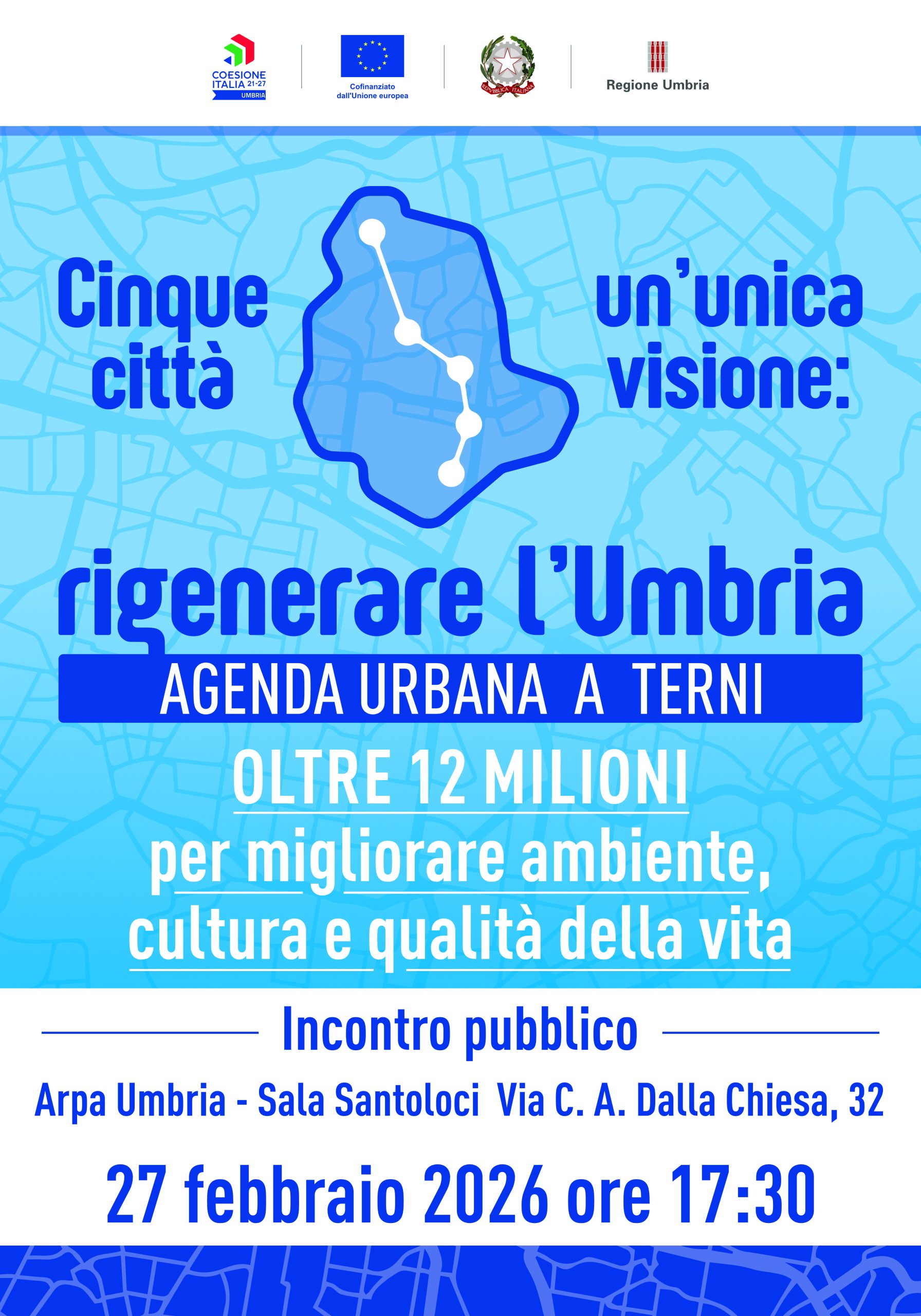 La Regione Umbria, invita a partecipare all’evento di presentazione del Piano strategico urbano sostenibile per Terni – il programma europeo gestito dalla Regione Umbria in co-progettazione con le amministrazioni locali volto alla rigenerazione sostenibile e alla riqualificazione delle aree urbane – che si terrà il giorno 27 febbraio alle ore 17:30 presso la sede di Arpa Umbria (sala Santoloci), via C. A. Dalla Chiesa, 32, – Terni.